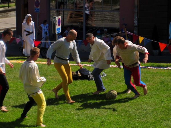 Kui aga laupäeval linna keskaja päevade sündmusi vaatama läksin, seekord üksi, siis tervitas mind Harju tänaval rongkäik jalgpalluritest, kel keskaegsed riided seljas ning kaenla all kartulikotist meisterdatud pall, mis ilmselt kaltse täis. Kõlava häälega kutsuti linnaelanikke jälgima altlinna ja ülalinna vahel toimuvat võistlust! Kohtunikuks oli uhkes rõivastuses ja veelgi uhkemas kübaras ning erkkollastes jalatsites meesterahvas, kelle toimetamist kommenteerisid pisut riiakad naisterahvad, kes sugugi ei tahtnud kõigi väravatega nõus olla.Punkte loeti roheliste ja punaste õunte abil, mis iga värava eest künkaservale kõigile vaatamiseks pandi ja mida võis salaja ära süüa! Nõnda läks küll väravate lugemine pisut segi, kuid keegi ei teinud sellest just suurt numbrit.