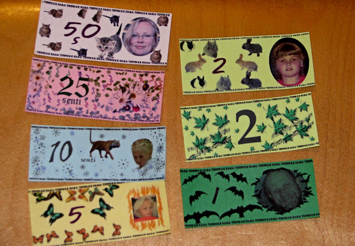 Teema on hetkel Eestis eriti aktuaalne! Mõni nutab kroone taga, mõni rõõmustab uue raha üle, mõni ei saa sotti, kui palju siis asjad õieti maksavad! Kui kõik üle pea hakkab minema, siis võib ju meie pere moodi OMA raha luua :D Timmude raha (pisikeses kirjas rahatähtede ääres) on sama palju väärt, kui Kanada dollarid. Need tekkisid meie perre siis, kui lapsed väikesed ning käis igat sorti punktide kogumine näiteks nõudepesu ja voodi kordategemise eest. Alguses piisas tasuks ainult klepsude andmisest, aga vanemaks saades otsustasin neid hoopis rahadega tuttavaks teha. Enam ei mäleta, mitme punkti eest kui palju raha sai, kuid alles hiljuti tuli Kirke veel Timmude valuutat päris raha vastu vahetma :) Kõik rahatähed on laste enda poolt minu juhendamisel arvutil loodud, kusjuures kõige tähtsamate tegelaste näod on ka uhkelt peale ilmunud (kahedollarisi on lausa kaks varianti, ühel on sõbranna Kati pilt).